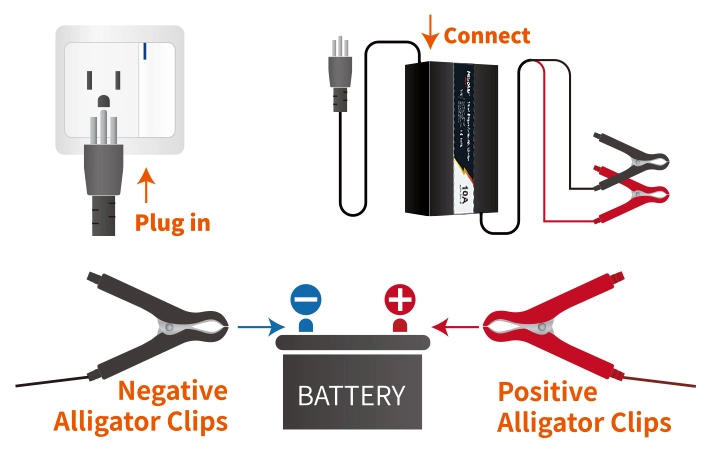 Connect the positive terminal of the charger to the positive terminal of the battery, connect the negative terminal of the charger to the negative terminal of the battery, and then press the charging switch to charge.